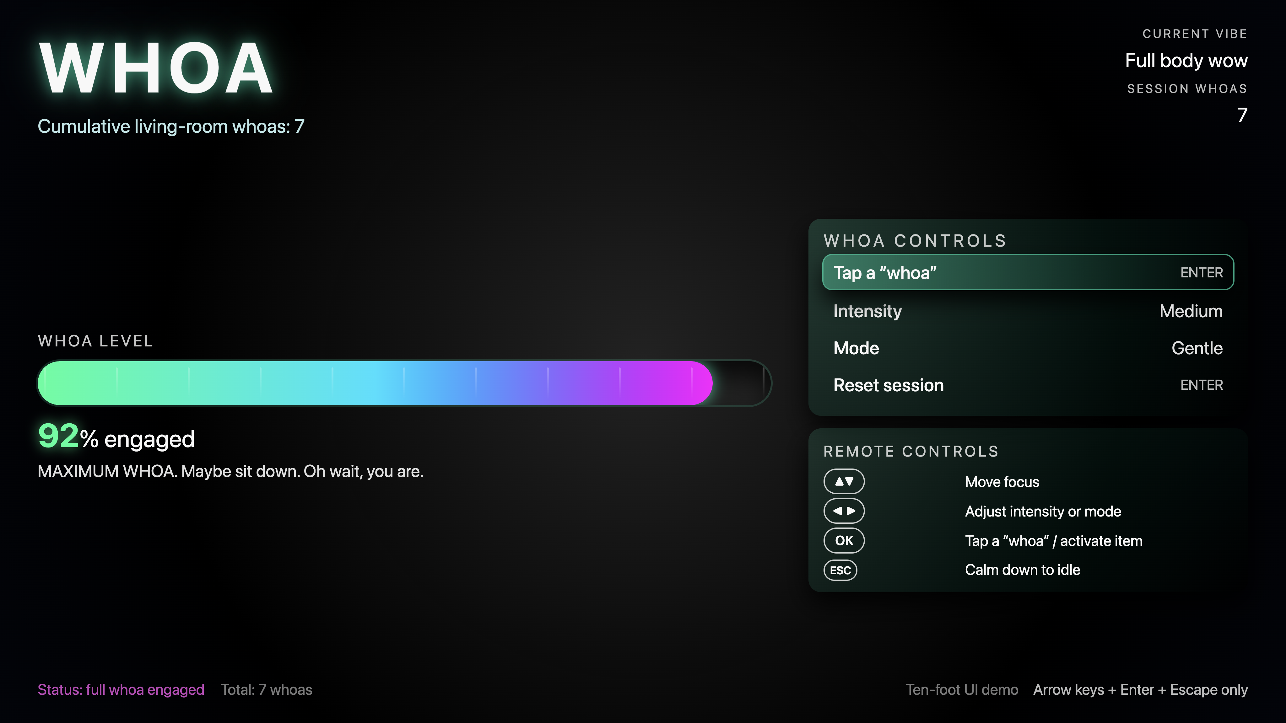 - Whoa — TV awesomeness meter made accidentally from a single-word promot: "whoa."