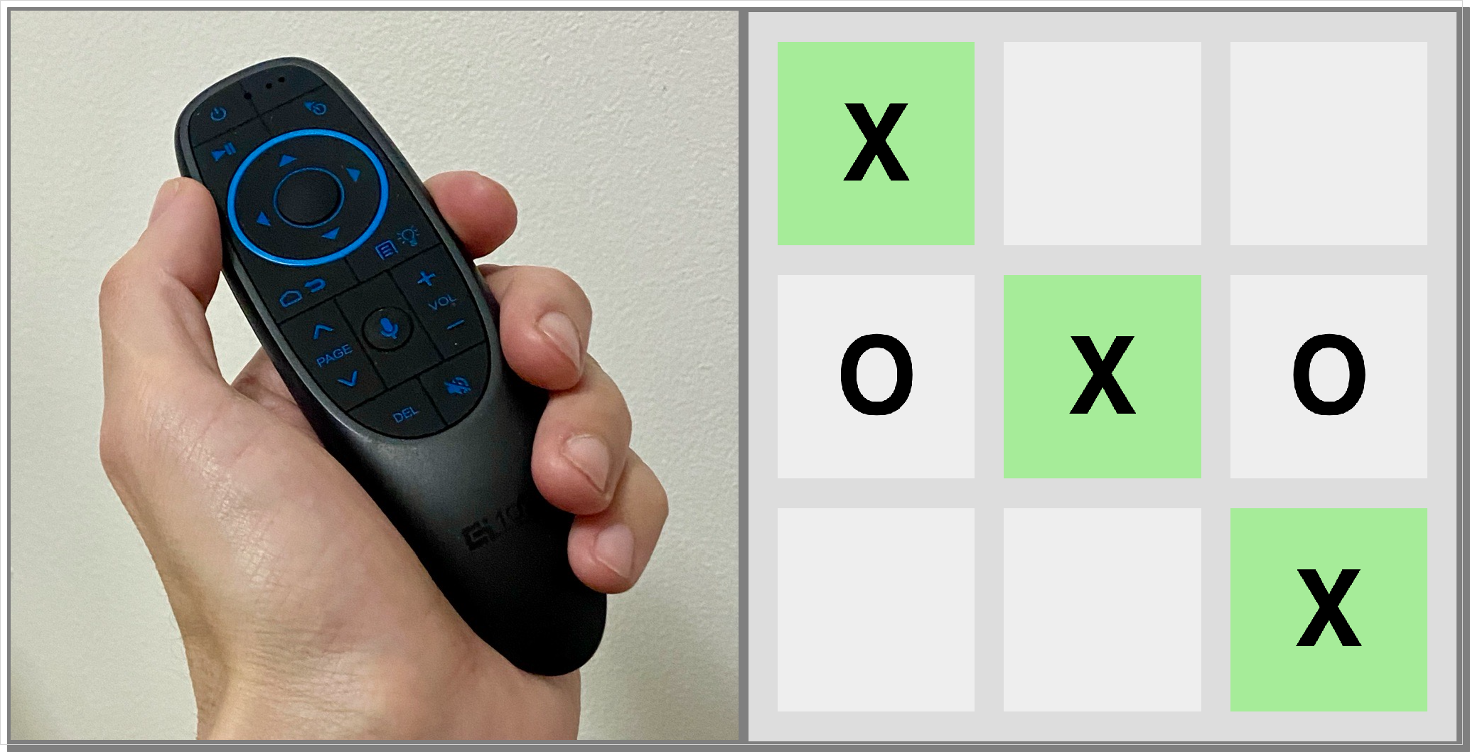 The players take turns with the remote, use the arrow keys to select a cell, and then hit enter to make a move. We check that nobody has already marked the current cell and that the game isn't over, and then put an X or an O in the cell. Then we switch whose turn it is.