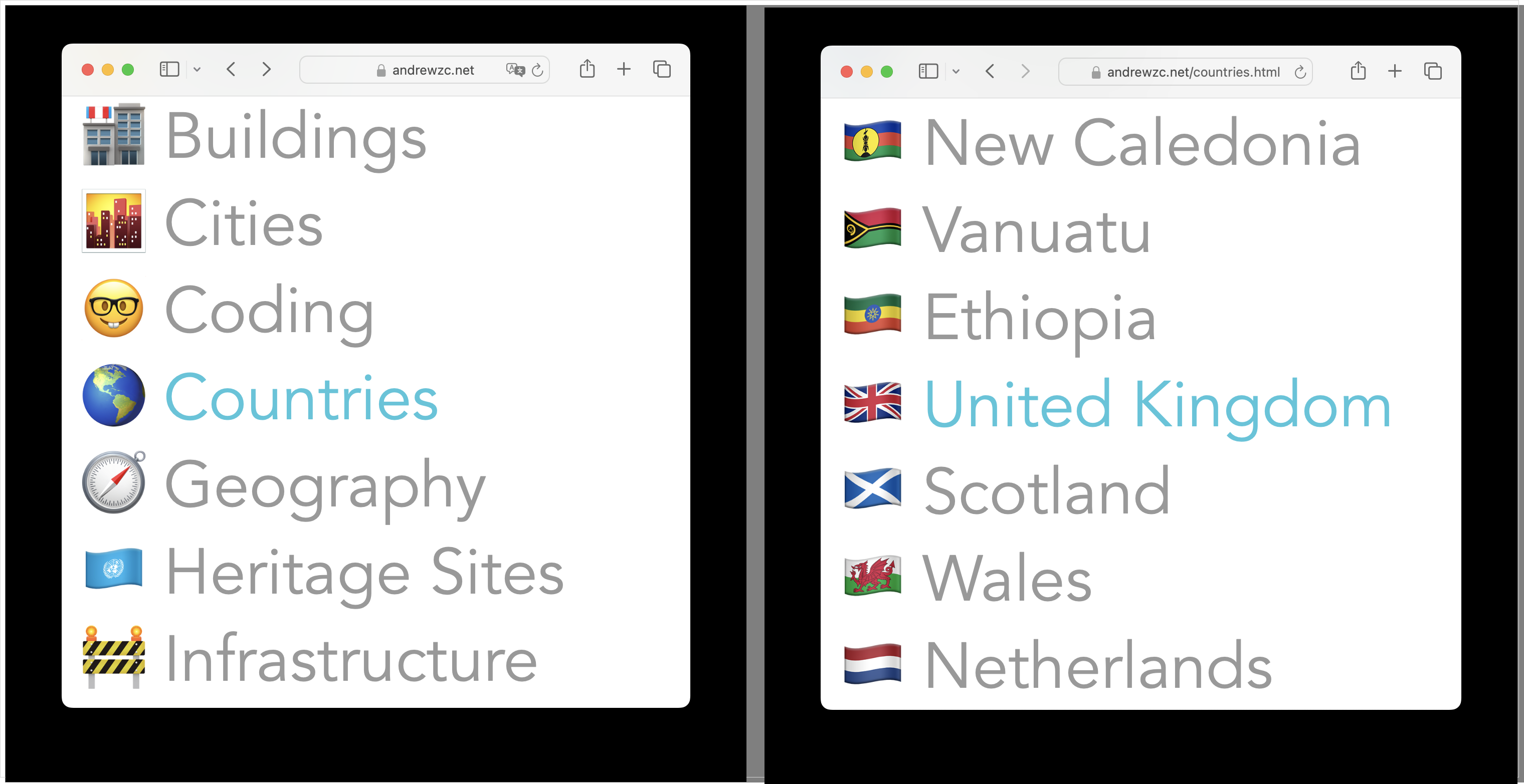 For this use case, we'll take an existing website filled with links and make it navigable using remote control based input. The website we'll use is https://andrewzc.net, which consists primarily of plain HTML pages each with a series of links. We want to introduce the concept of focus so we can select the links, use the up/down keys to move between links on a page, use the enter key to follow links, and the back key to return to the previous page.